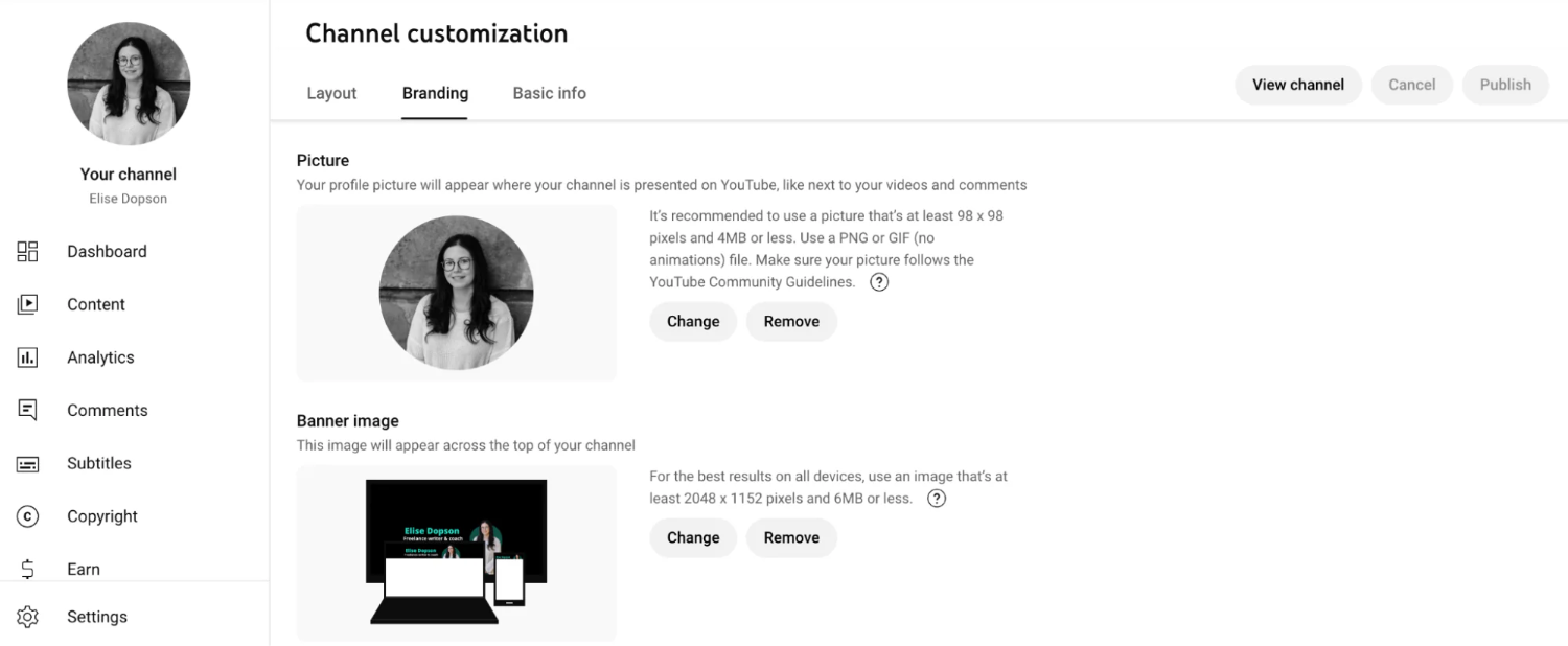ขั้นตอนต่อมาของวิธีสร้างช่อง YouTube ในโปรไฟล์ช่องใหม่ของคุณ จะมี 2 จุดที่คุณสามารถสร้างความประทับใจด้วยภาพได้ นั่นก็คือ รูปโปรไฟล์ของคุณ และภาพแบนเนอร์ คุณสามารถอัปโหลดทั้งสองภาพไปยังแท็บ “Branding” ของบัญชี YouTube ของคุณ ซึ่งอยู่ภายใต้ “Channel customization”